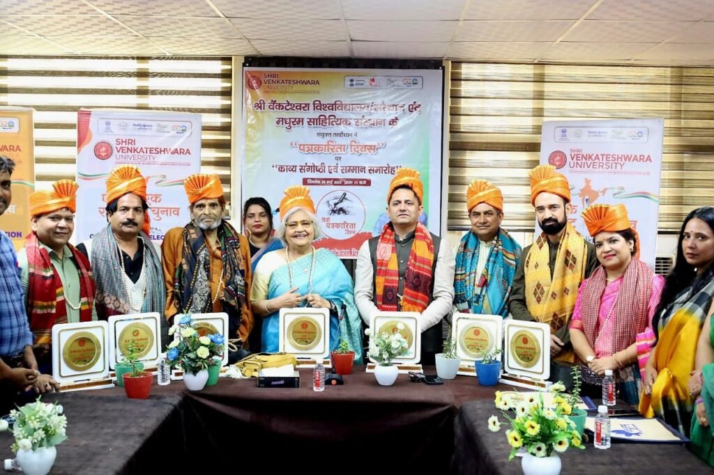 मेरठ। राष्ट्रीय राजमार्ग बाईपास स्थित श्री वेंक्टेश्वरा विश्वविद्यालय/संस्थान में ’’हिन्दी पत्रकारिता दिवस’’ पर साहित्यिक संस्था ’’मधुरम’’ के संयुक्त तत्वाँधान में ’’भव्य काव्य संगोष्ठी एवं सम्मान समारोह का शानदार आयोजन किया गया, जिसमें देश के विभिन्न हिस्सों से पधारे दो दर्जन से अधिक कवियो/कवियत्रियों, शायरो ने देश में लोकतन्त्र के चौथे स्तम्भ ’’मीडिया’’ के सम्मान में एक से बढ़कर एक रचनाऐ पेश करते हुए ’’मीडिया’’ को सरकार एवं आमजनमानस के बीच का ’’सेतु’’ करार दिया। इस अवसर पर संस्थान प्रबन्धन की ओर से देश के विभिन्न हिस्सो से पधारे कवियो एवं साहित्यकारों को शॉल, स्मृति चिन्ह, तुलसी माला, पटका एवं पगड़ी भेट कर सम्मानित किया गया।